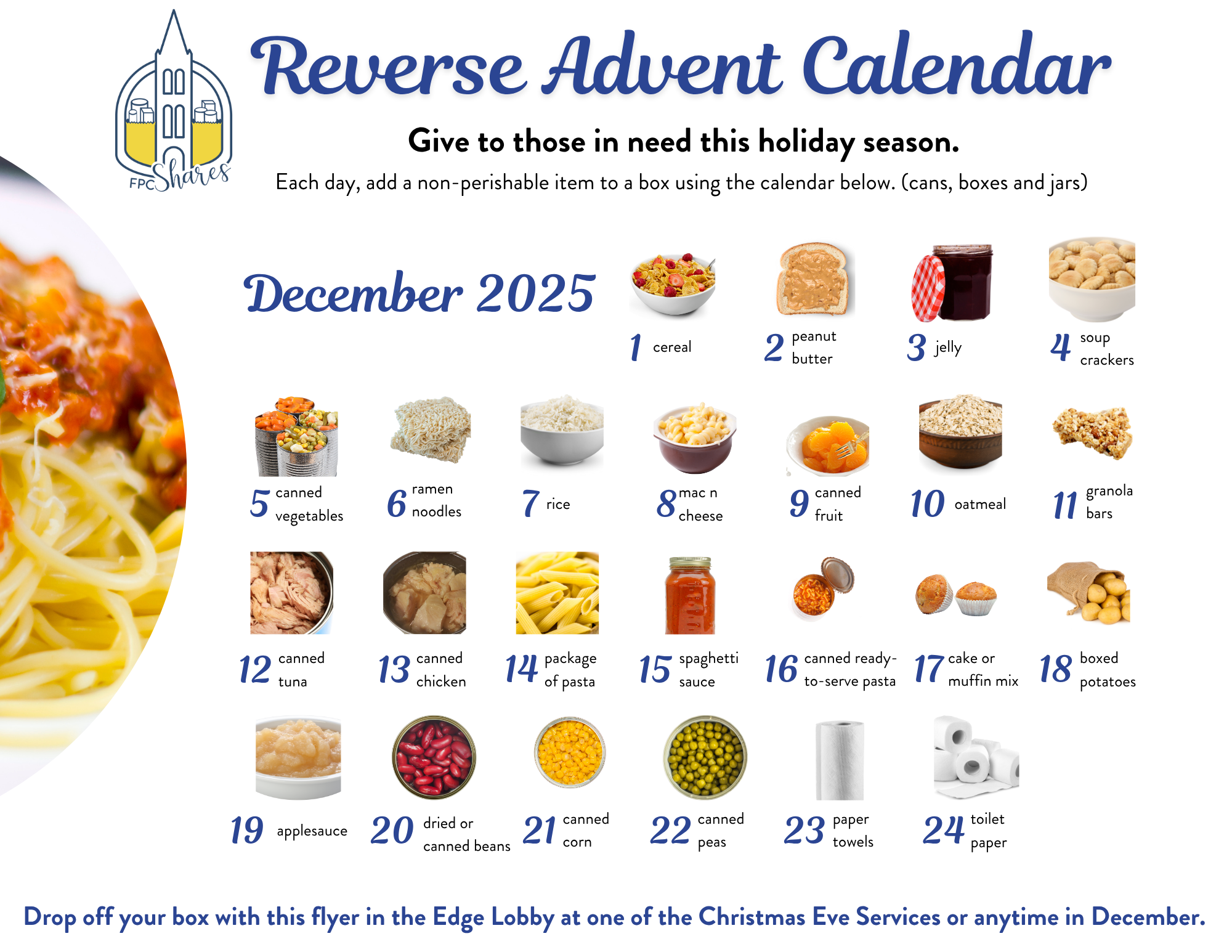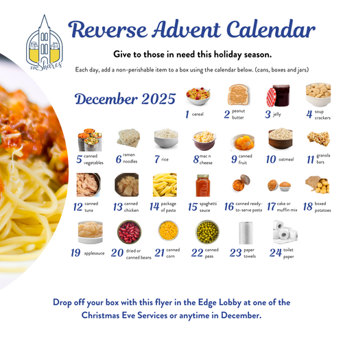 Give to those in need this holiday season. Each day, add a non-perishable item to a box (cans, boxes and jars). Drop off your box with this flyer at one of the Christmas Eve Worship Services or any Sunday morning at the church in the Edge Lobby. Click here to download the calendar.