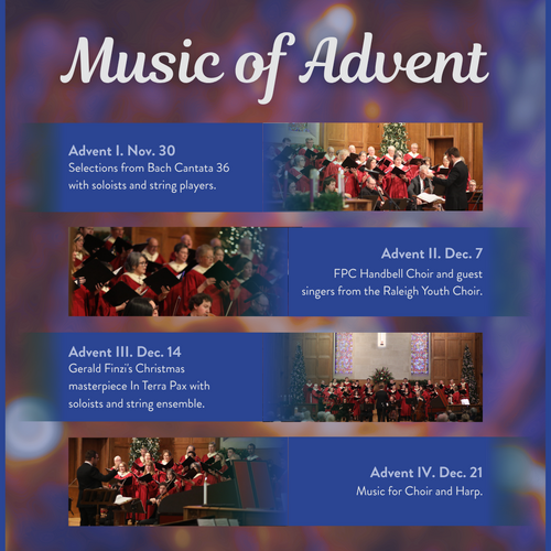 This will be a meaningful service for those who are grieving as well as anyone looking to experience the miracle of the incarnation in a beautiful time of worship. This service will be Monday, December 8, at 7pm. Email Laurie Taylor Weicher at lwiecher@fpcraleigh.org with any questions.